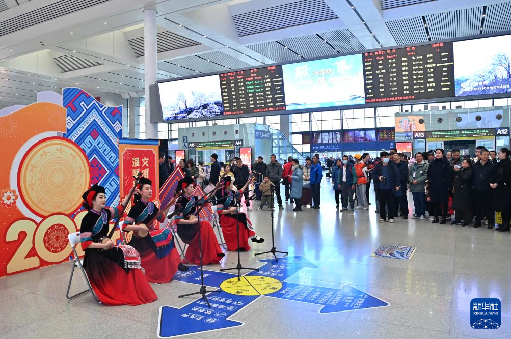 当日,广西南宁市南宁东站开展“温馨春运、文明相伴”主题宣传活动。工作人员和志愿者通过送剪纸、歌舞表演等活动,温暖乘客的回家路。