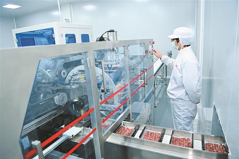 1月25日,在柳工集团食品投资有限公司食品智慧工厂腊味外包生产线上,机械手抓取包装袋自动传输到包装设备上进行密封,再经过传输带去到下一个包装工序。一袋袋腊肠从原料到包装实现全自动化生产。