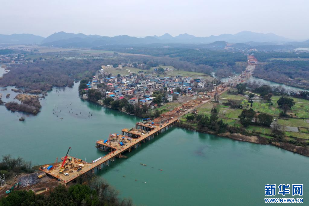 建设中的广西全州至灌阳高速公路湘江特大桥(1月24日摄,无人机照片)。新华社记者 陆波岸 摄
