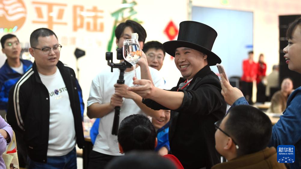 2月3日,魔术师与职工互动表演魔术。