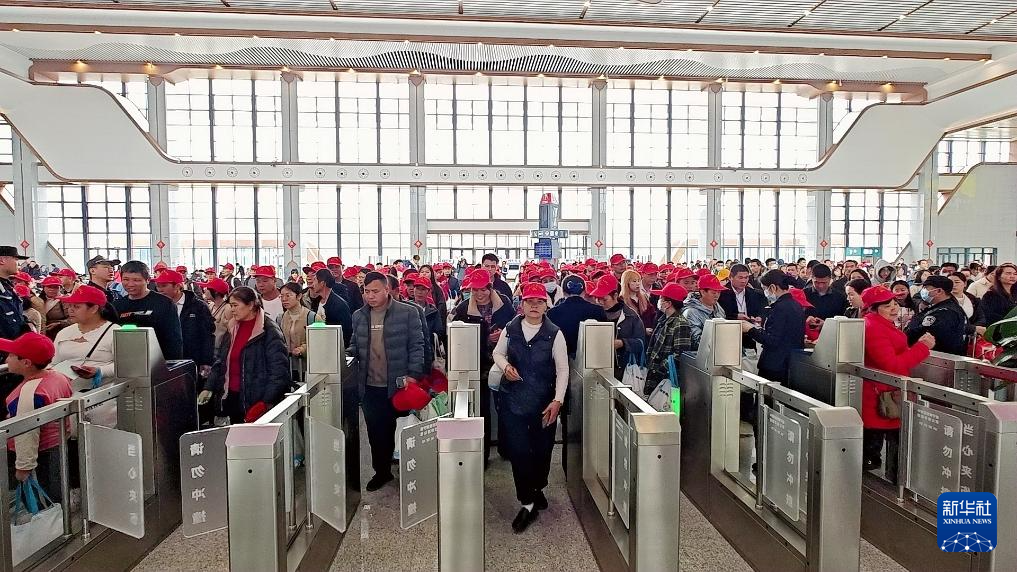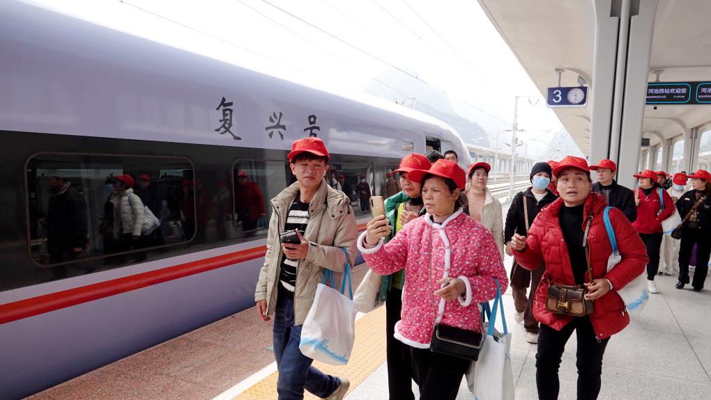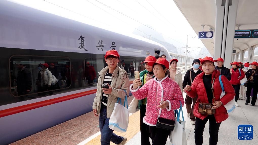 2月15日,广西河池市的外出务工人员在河池西站乘坐当地组织的免费高铁列车返岗复工。