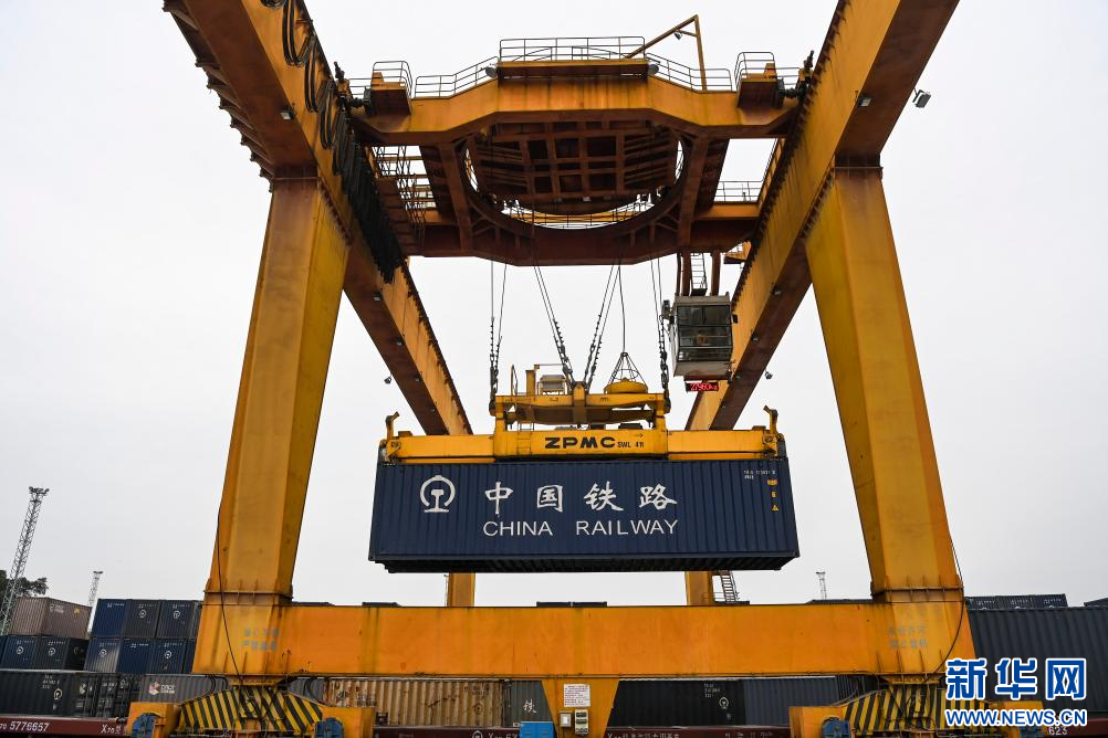 3月8日,在南宁国际铁路港,工作人员在吊装集装箱。