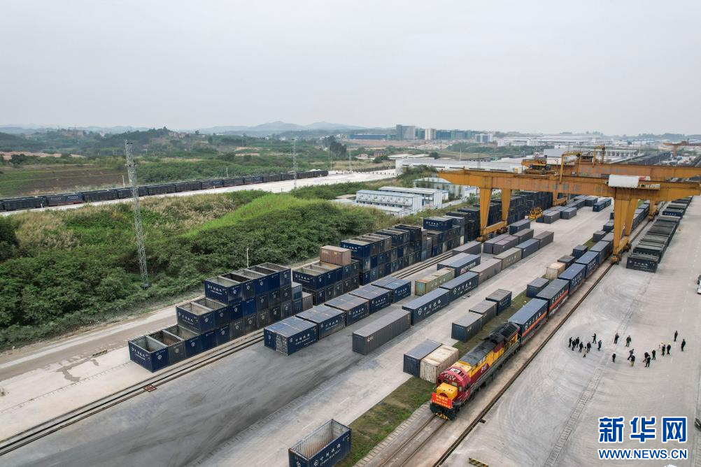 3月8日,在南宁国际铁路港,电力铁塔专列准备发车。