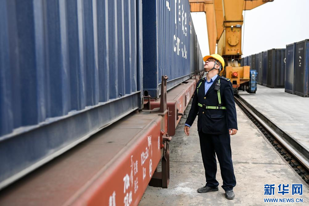 3月8日,在南宁国际铁路港,工作人员在检查集装箱。