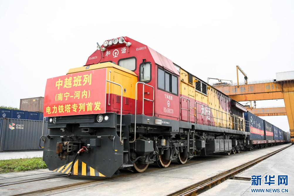 3月8日上午,一列满载340吨电力铁塔的中越班列从广西南宁国际铁路港开出,发往越南河内。这是广西首次开行电力铁塔专列。