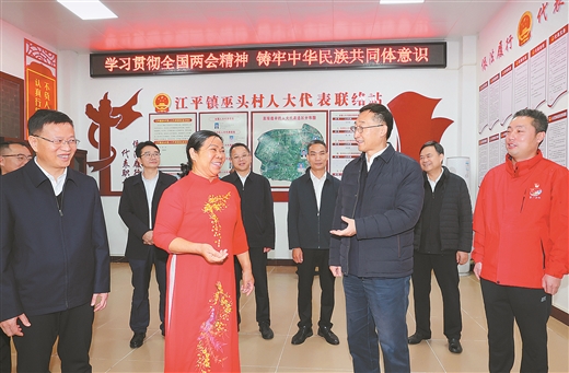 东兴是我国京族唯一的聚居地。刘宁来到京族博物馆,详细了解京族文化艺术传承和保护有关情况。在京族三岛之一的江平镇巫头村,刘宁沿着村道察看村容村貌,走进人大代表联络站与基层人大代表交流,详细了解京族群众生产生活以及参与建设铸牢中华民族共同体意识示范区有关情况。“我区作为全国少数民族人口最多的自治区,民族关系十分融洽,有基础、有条件、有责任在铸牢中华民族共同体意识上走在前作示范。”刘宁说,要深入贯彻落实习近平总书记关于加强和改进民族工作的重要思想,把铸牢中华民族共同体意识作为全区各项工作的主线,加快推进铸牢中华民族共同体意识示范区建设,齐心协力构筑中华民族共有精神家园,建设共同富裕幸福家园、守望相助和谐家园、宜居康寿美丽家园、边疆稳定平安家园,促进各族人民交往交流交融,像石榴籽一样紧紧抱在一起,让“五个认同”深深扎根八桂大地、融入各族人民血脉。