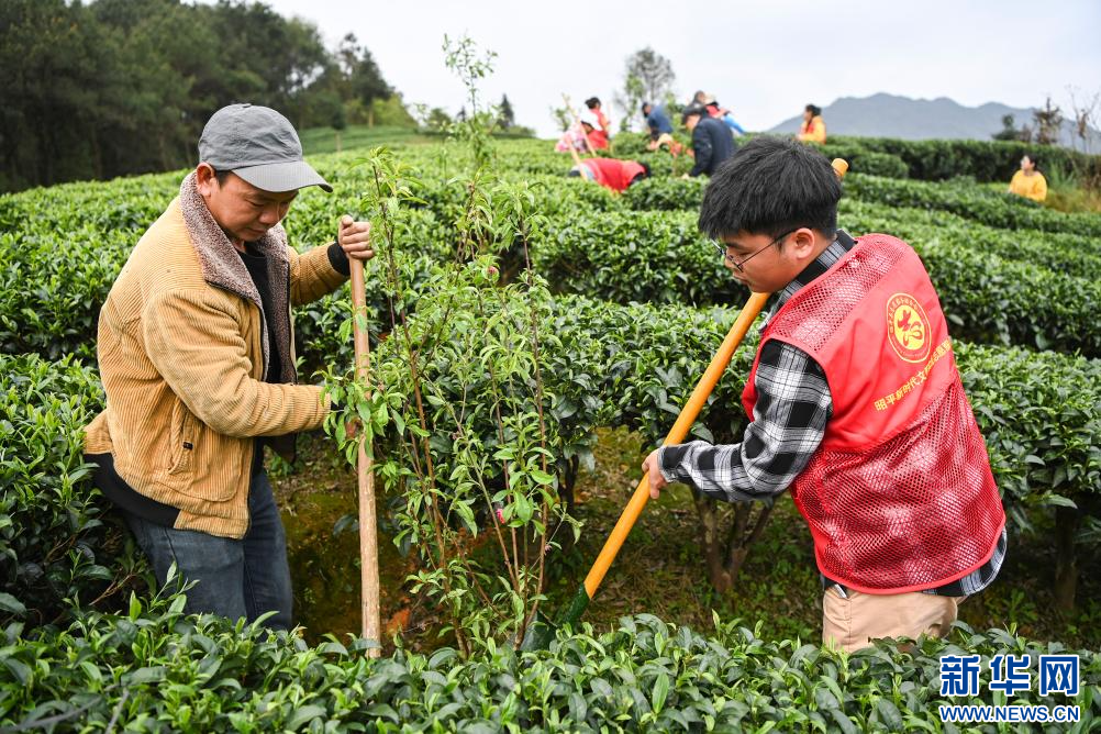 3月20日,在广西昭平县一处茶园,志愿者和村民一起栽种果树。