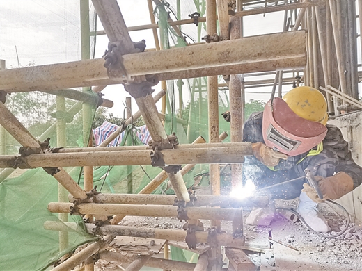 田阳区的阀房建设进入尾声,工人正在进行电焊作业。