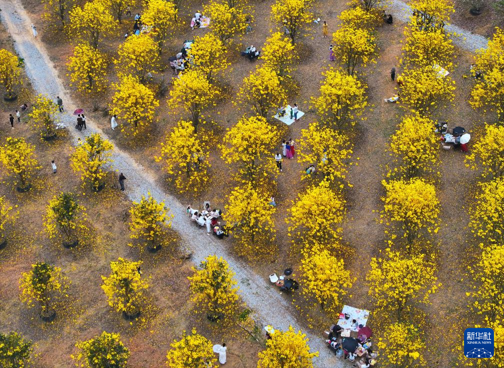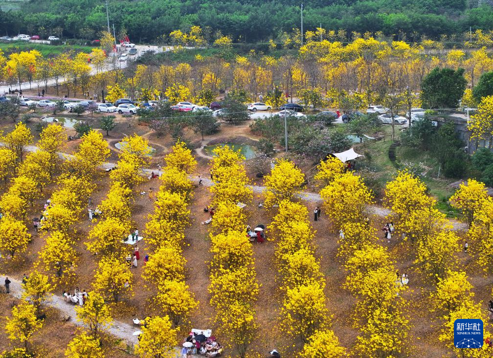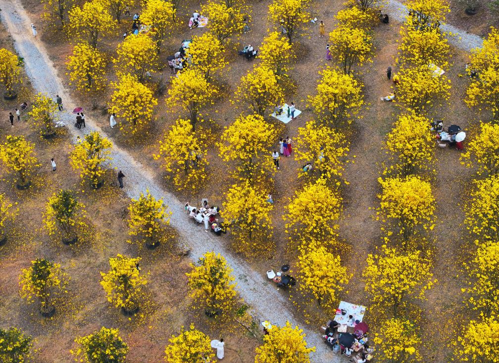 3月23日,游客在广西南宁市兴宁区三塘镇建宁苗木场观赏黄花风铃木(无人机照片)。