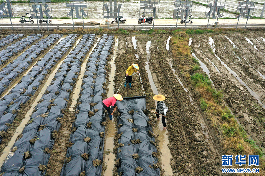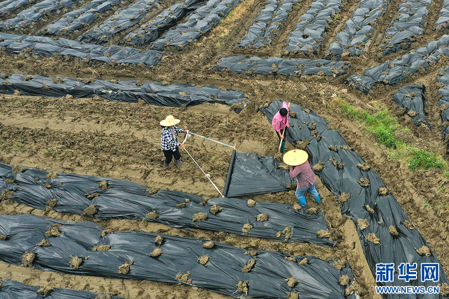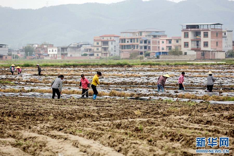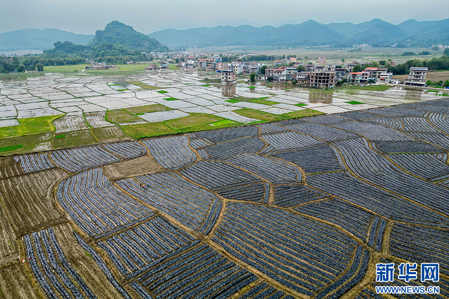 在贺州市八步区信都镇,村民在为新种的芋头盖地膜。