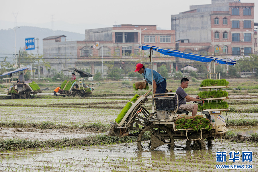 在贺州市八步区信都镇,插秧机正在插秧。