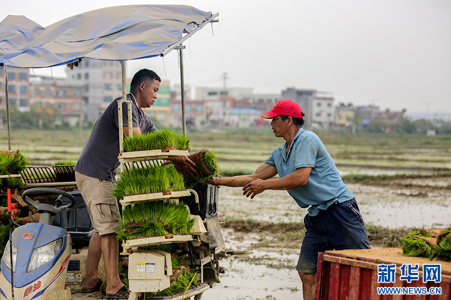 在贺州市八步区信都镇,村民在装秧苗。