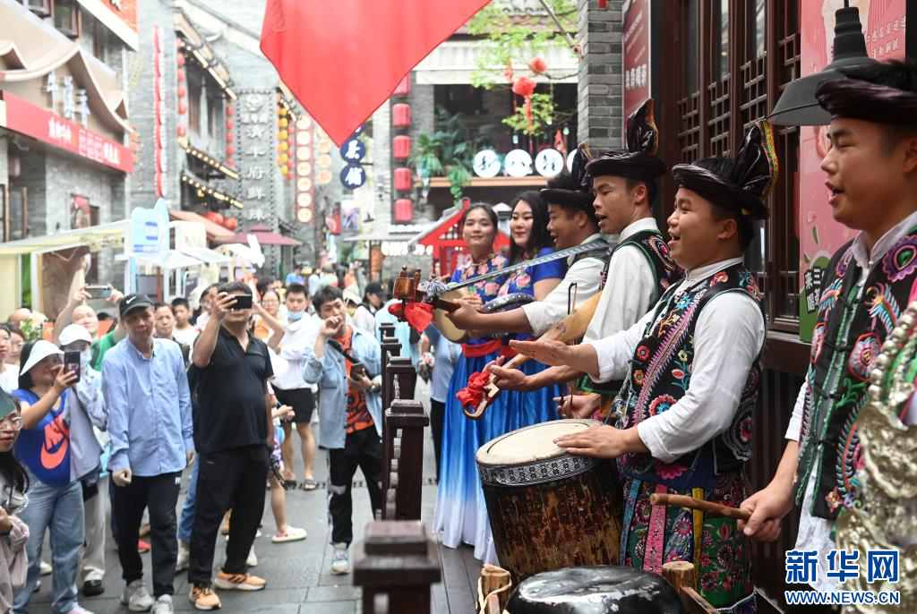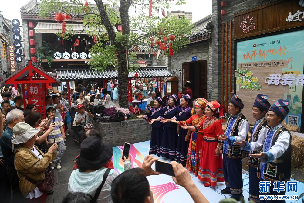 4月13日,演员在广西南宁市三街两巷表演节目。