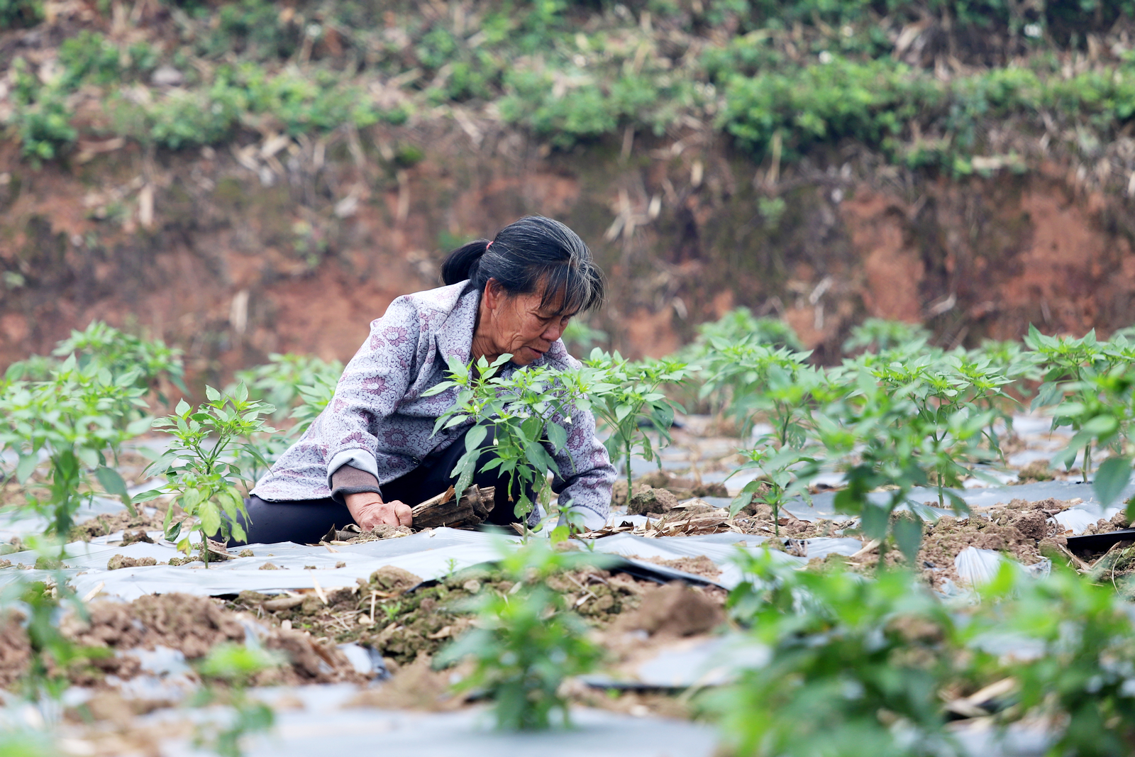 良庆区大塘镇南荣村农民在辣椒地进行除草。闭业然 摄