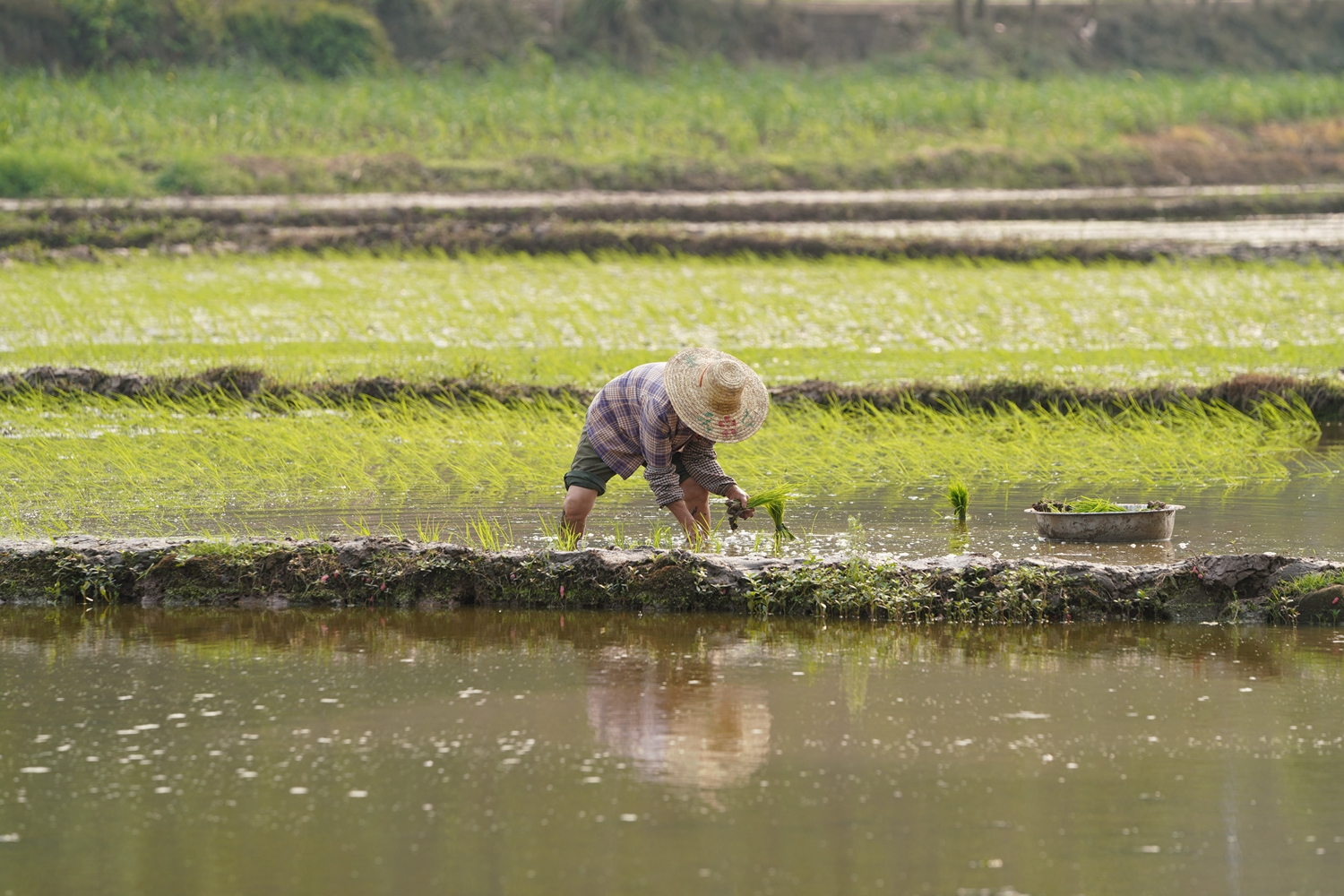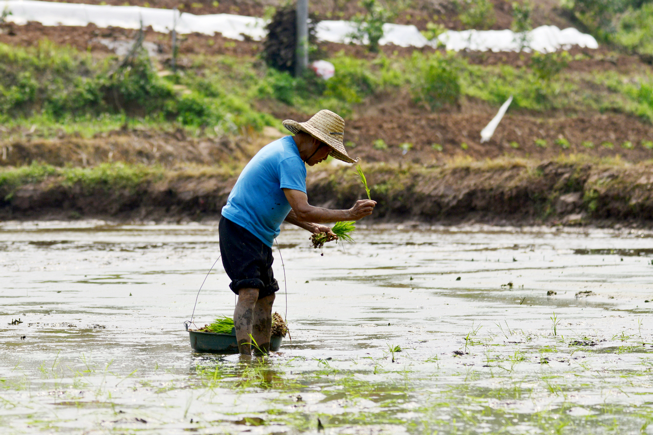 良庆区大塘镇农民正在田间插秧。闭业然 摄