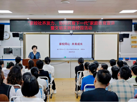 4月23日,南宁市江南区新时代文明实践中心、关工委、文明办、妇联、教育局在南宁市八桂绿城小学联合开展江南区“家校社齐发力,协同共育下一代”家庭教育宣讲暨文明实践进校园活动,进一步营造关爱青少年健康成长的良好社会环境。