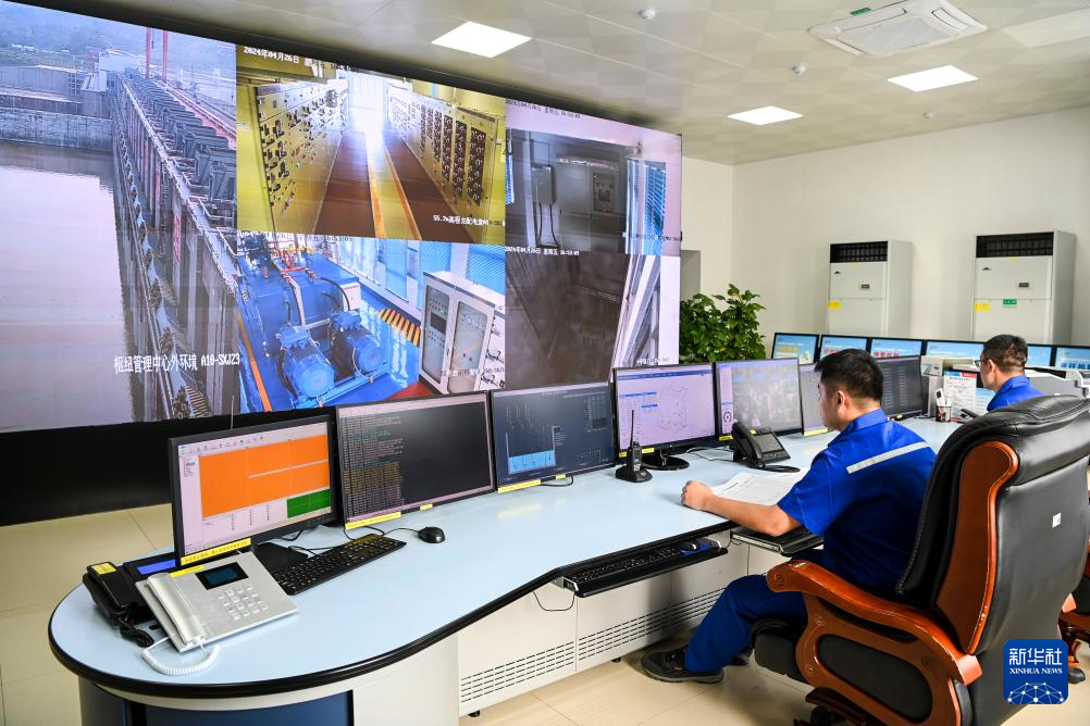 4月26日,在大藤峡水利枢纽工程,工作人员通过大屏幕监看大坝关键部位的运行情况。