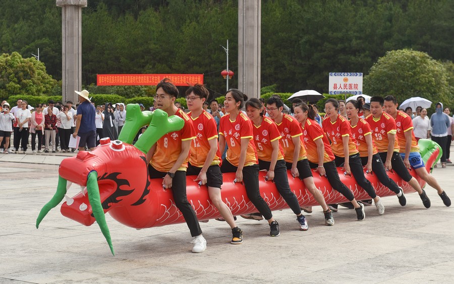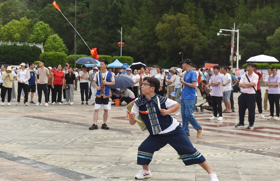 在比赛活动现场,背篓绣球、旱地龙舟等民族体育和趣味运动妙趣横生,参赛队员们团结协作、配合默契,共同展现运动的魅力。 (覃莉娱)