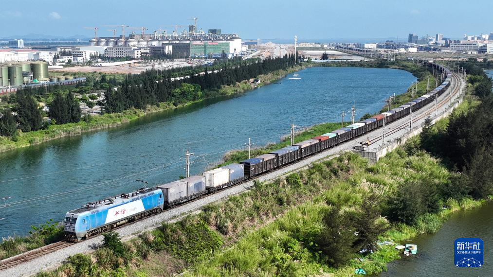 图为一趟满载货物的西部陆海新通道铁海联运班列从钦州港东站驶出(无人机照片)。新华社记者 张爱林 摄