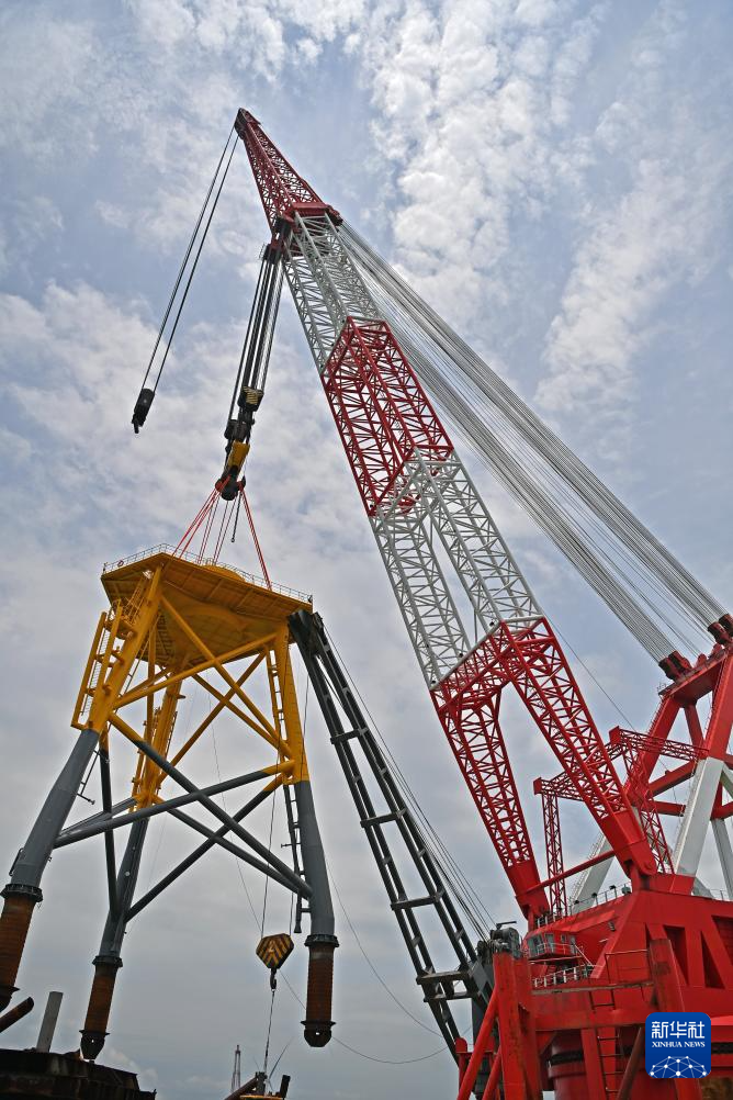 吊机正在吊起导管架(5月21日摄)。