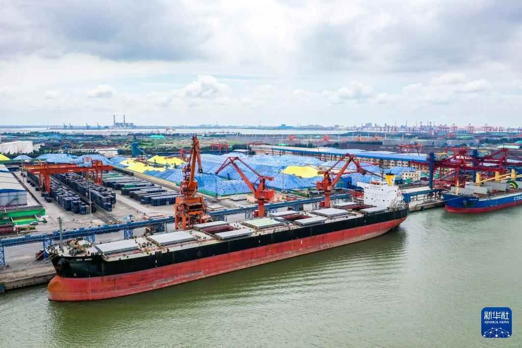 货轮在防城港码头卸货(5月21日摄,无人机照片)。