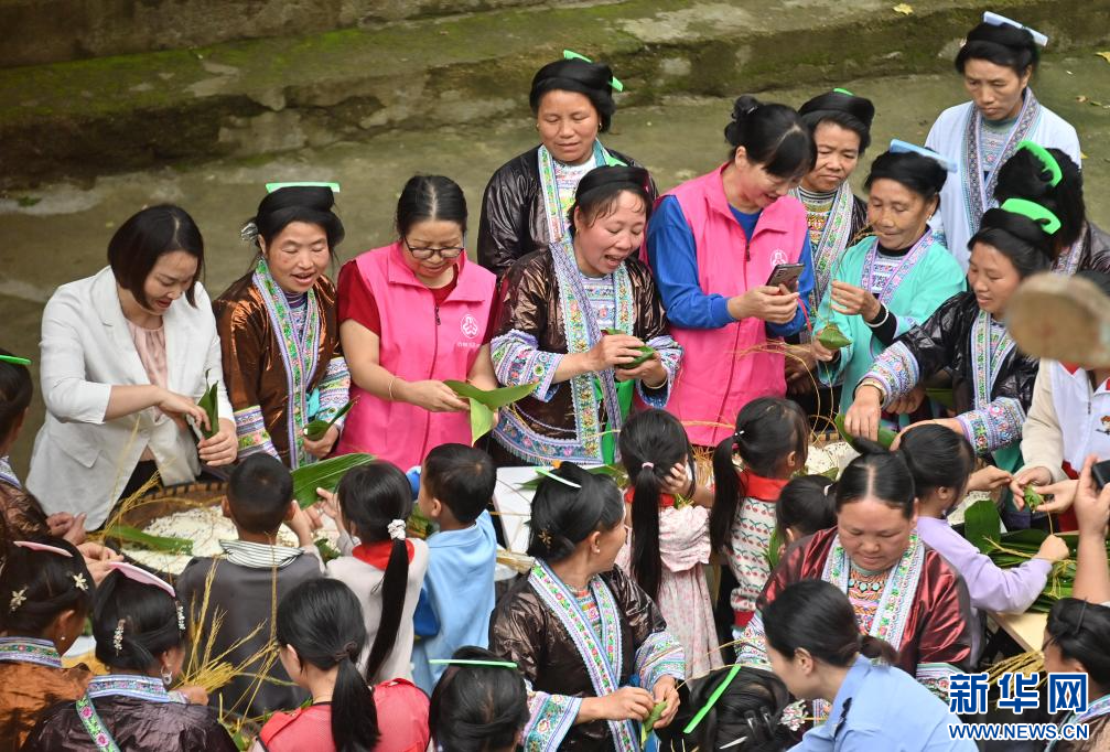 6月5日,在桂黔乌英苗寨,妇联干部和妇女在包粽子。