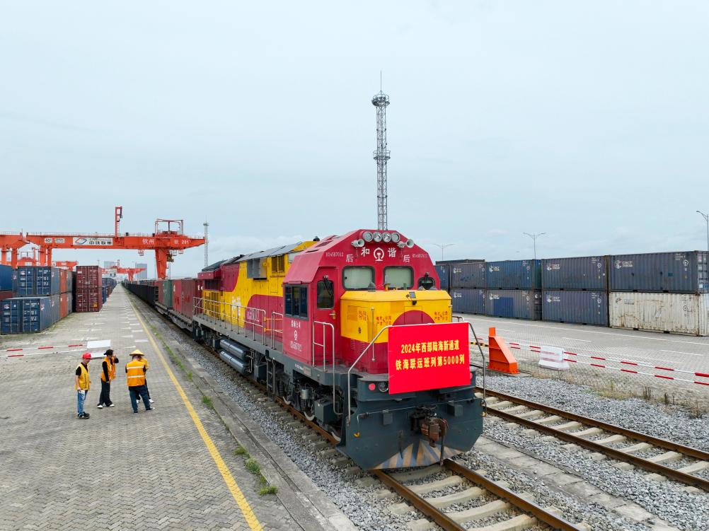 6月14日上午,2024年西部陆海新通道海铁联运班列第5000列,从钦州铁路集装箱中心站缓缓发出。(广西北部湾港务集团供图)