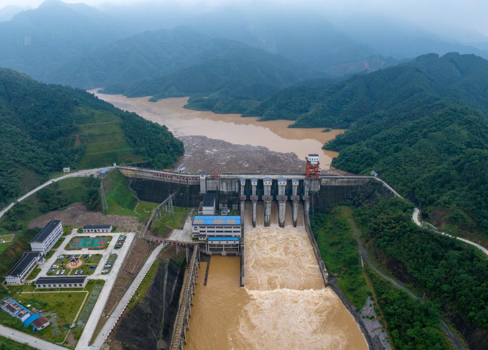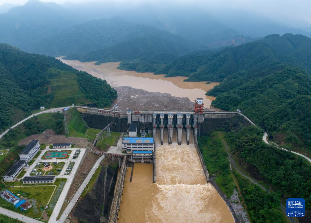 6月19日,在广西柳州市融水苗族自治县贝江,落久水利枢纽在泄洪(无人机照片)。
