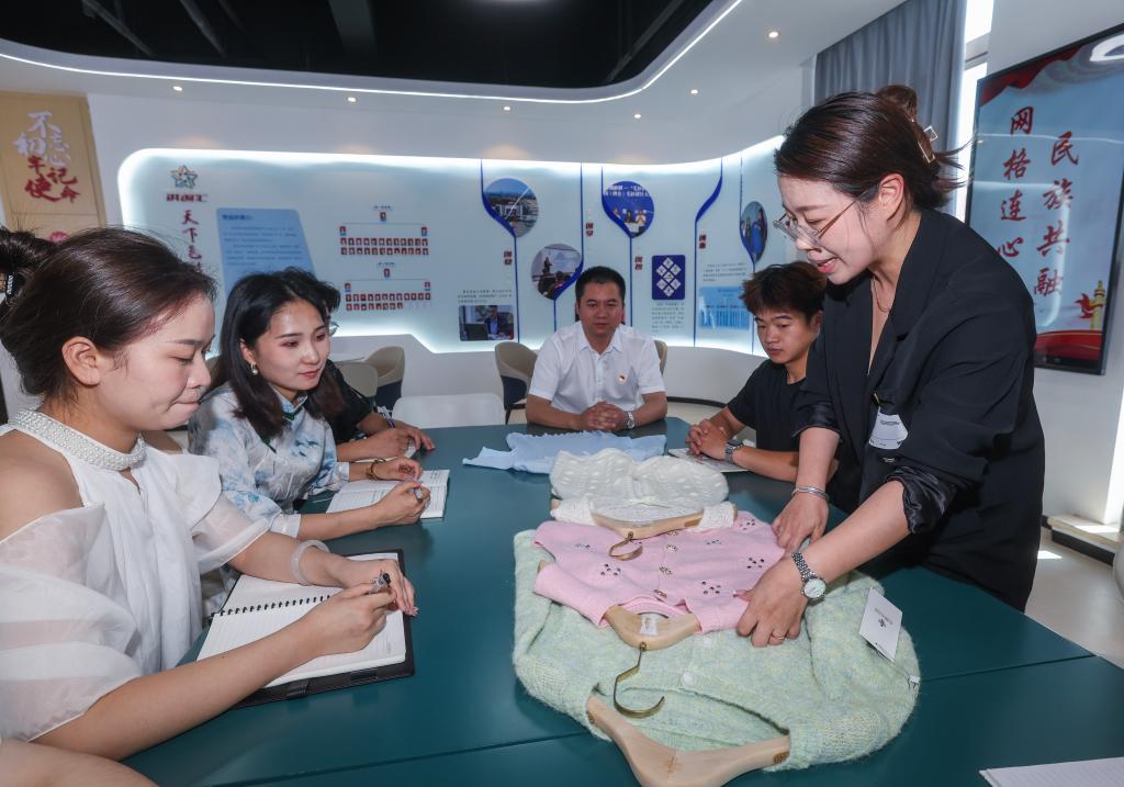 2024年6月18日,在位于洪合镇新王桥村的嘉兴市众创毛衫精品市场的党群服务中心,嘉兴市秀洲洪合毛衫商会第二党支部的支部书记田银燕(右一)为商户们介绍新款毛衫并共同商讨推广方案。新华社记者 徐昱 摄