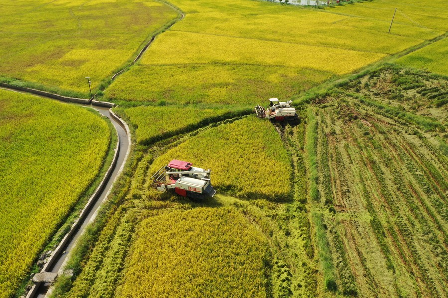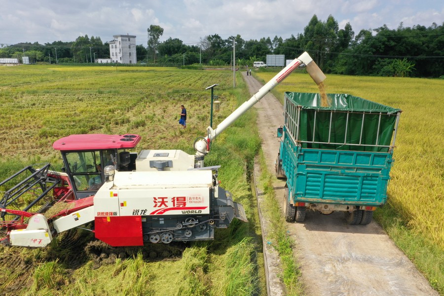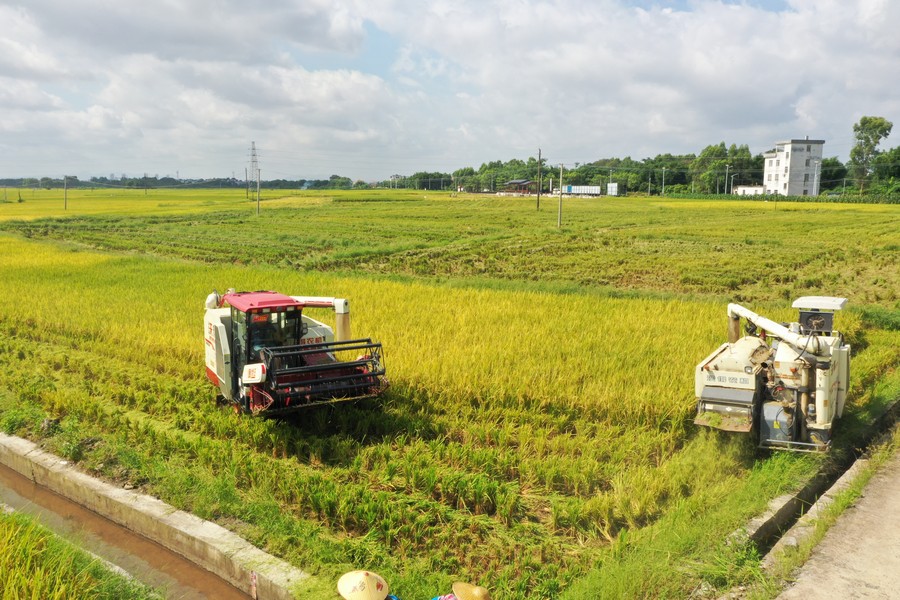 火红七月,稻谷飘香。广西贵港市平南县38.2万亩早稻陆续进入收割期,农户们趁着连日来的晴好天气,忙着收割稻谷,确保颗粒归仓。