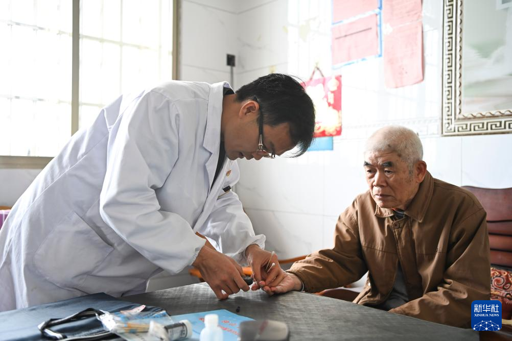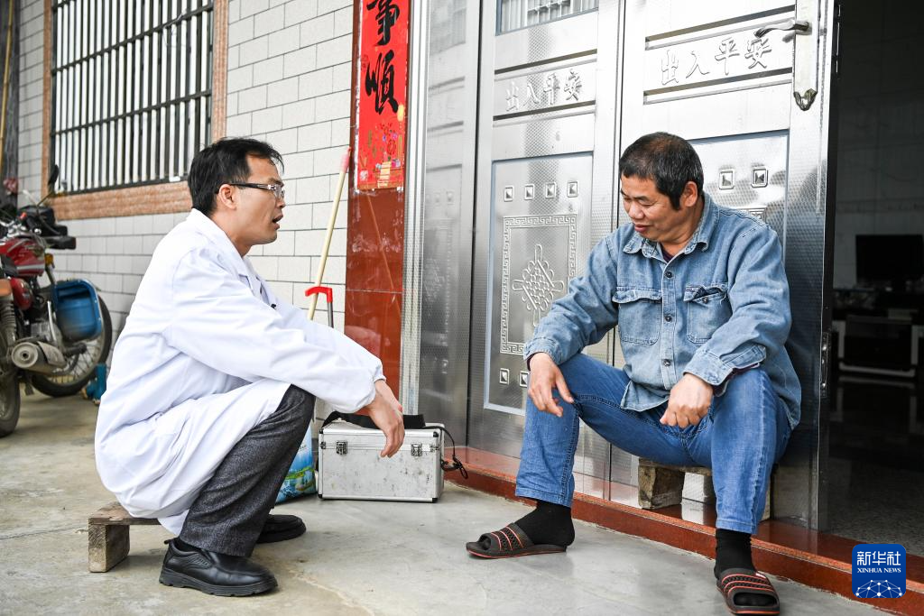 在贺州市钟山县石龙镇松桂村,乡村医生潘绍瑜(左)上门为村民测血糖(3月28日摄)。