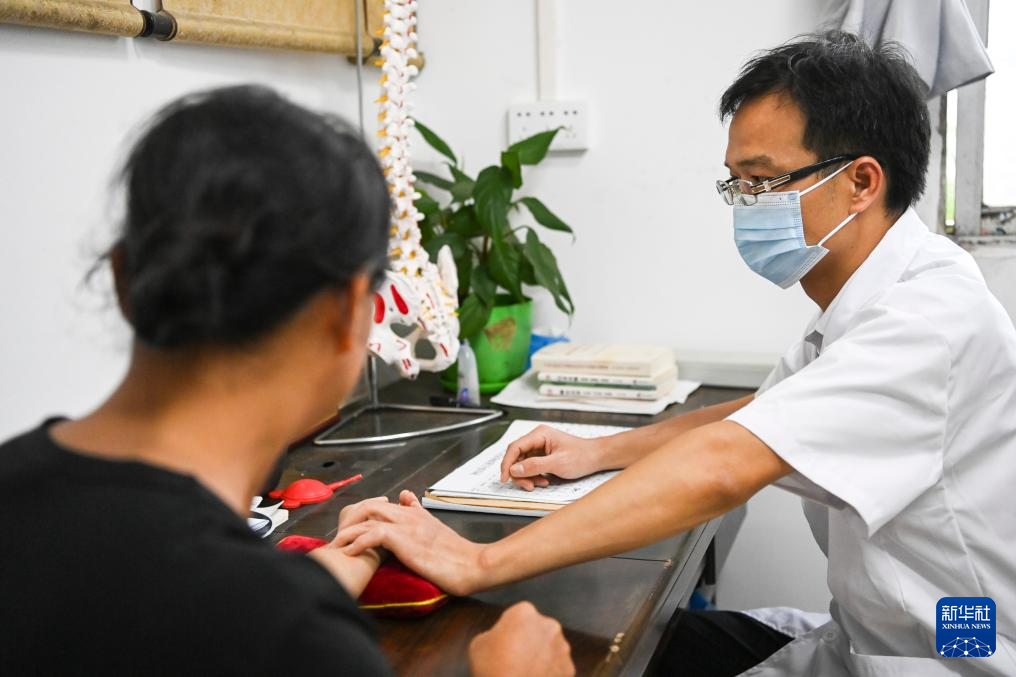 8月14日,在贺州市钟山县石龙镇松桂村卫生室,乡村医生潘绍瑜(右)为患者诊脉。