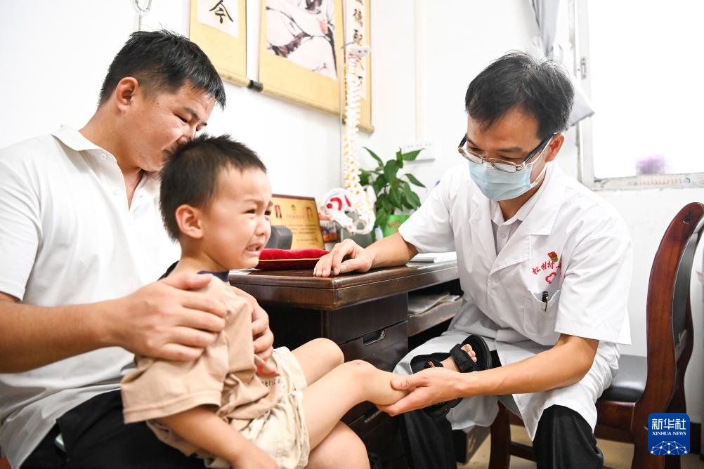8月14日,在贺州市钟山县石龙镇松桂村卫生室,乡村医生潘绍瑜(右一)为小朋友检查腿部伤势愈合情况。