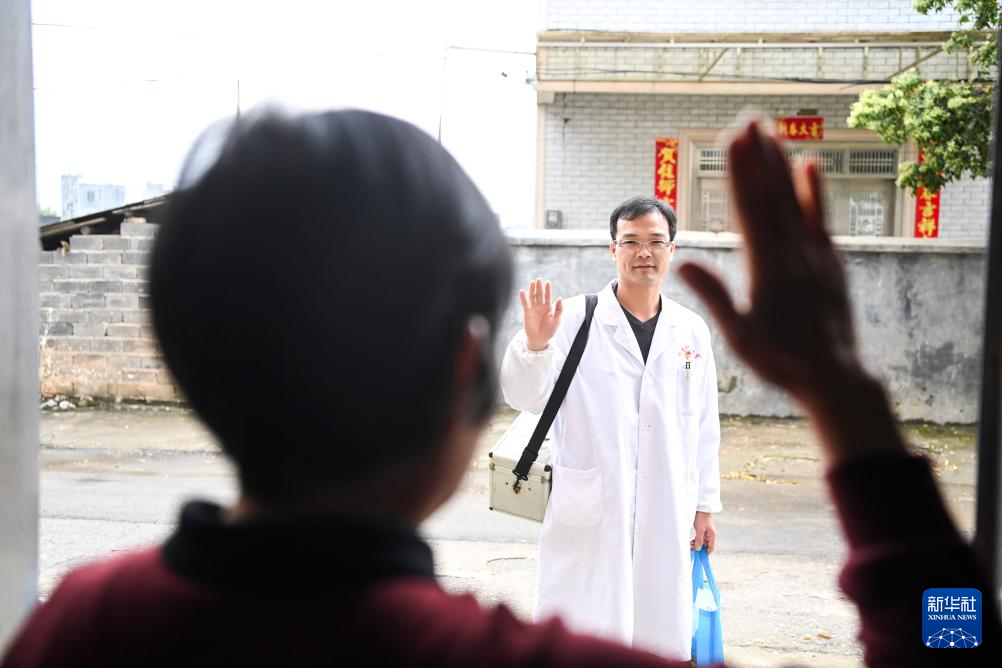 在贺州市钟山县石龙镇松桂村,乡村医生潘绍瑜(右)出诊结束后与村民挥手道别(3月28日摄)。