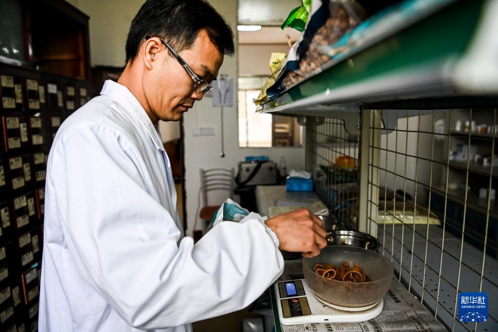 在贺州市钟山县石龙镇松桂村卫生室,乡村医生潘绍瑜在抓药(3月28日摄)。