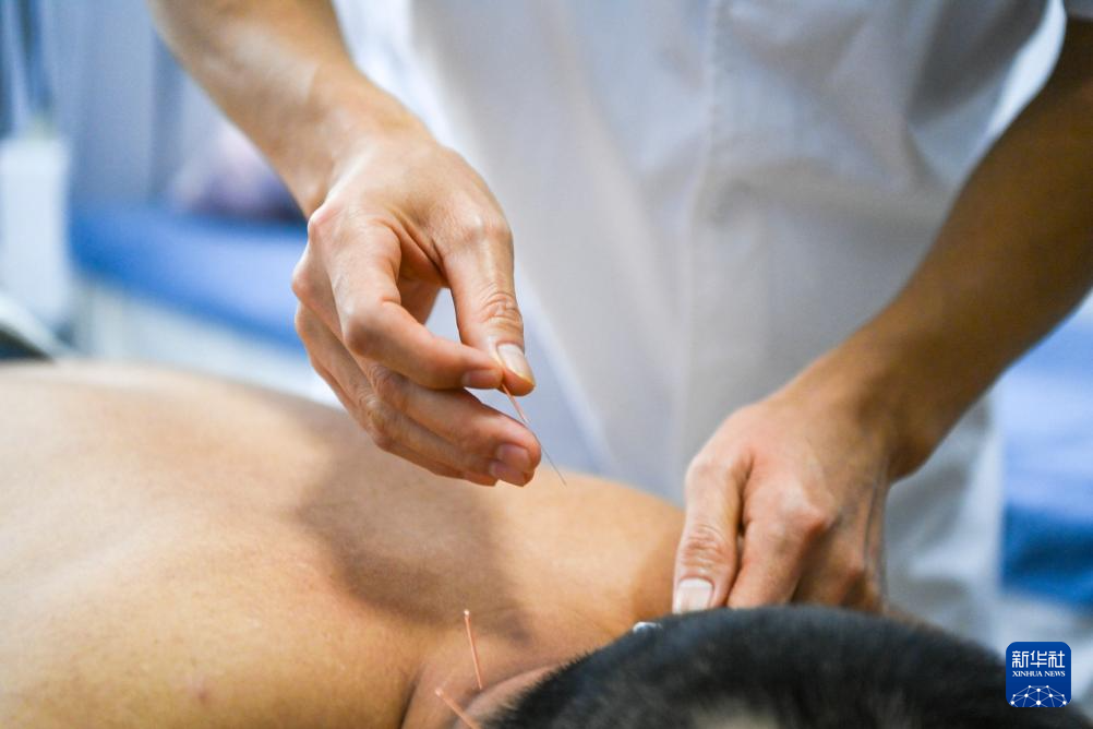 8月14日,在贺州市钟山县石龙镇松桂村卫生室,乡村医生潘绍瑜为患者进行针灸治疗。