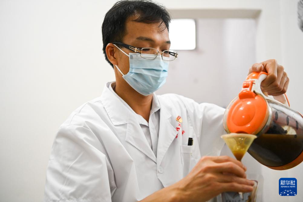 8月14日,在贺州市钟山县石龙镇松桂村卫生室,乡村医生潘绍瑜为患者灌装煮好的中药。