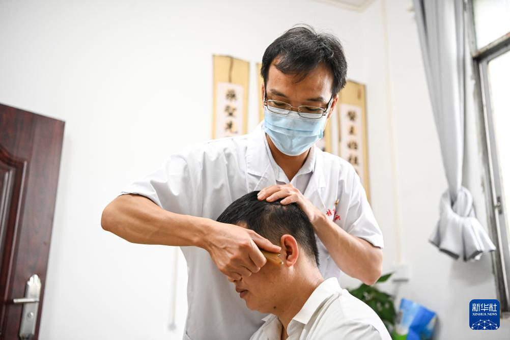 8月14日,在贺州市钟山县石龙镇松桂村卫生室,乡村医生潘绍瑜为患者进行刮痧治疗。