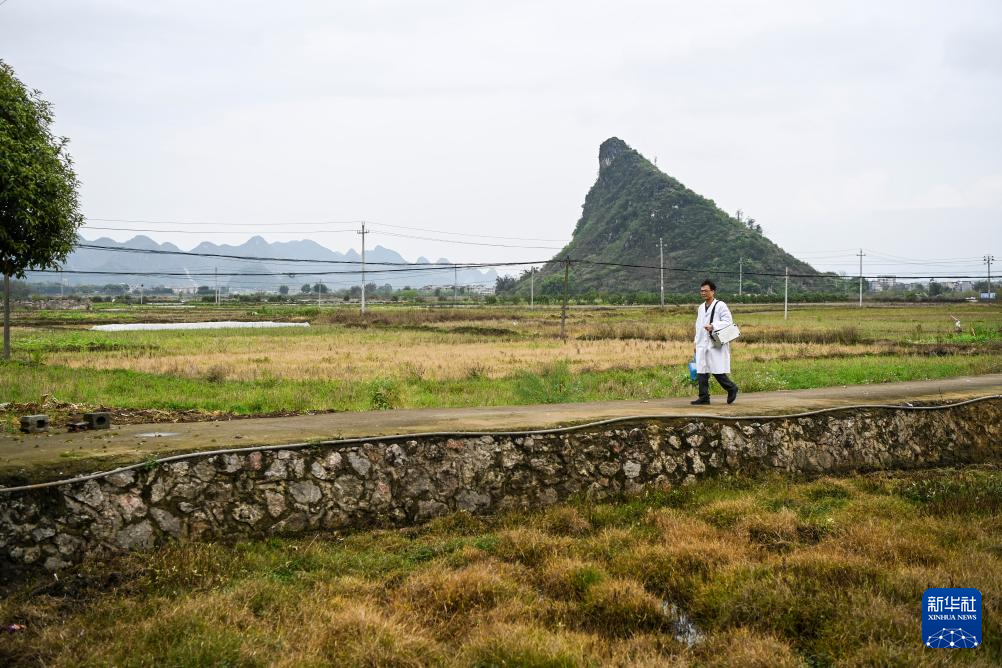 在贺州市钟山县石龙镇松桂村,乡村医生潘绍瑜行走在出诊路上(3月28日摄)。