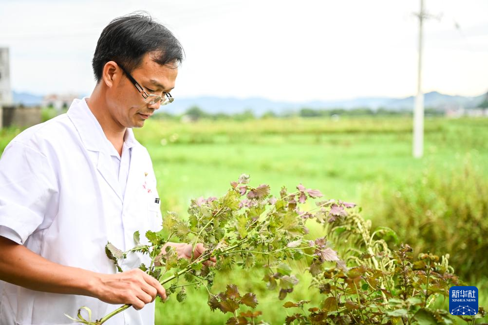 8月14日,在贺州市钟山县石龙镇松桂村,乡村医生潘绍瑜在户外采集中药材。