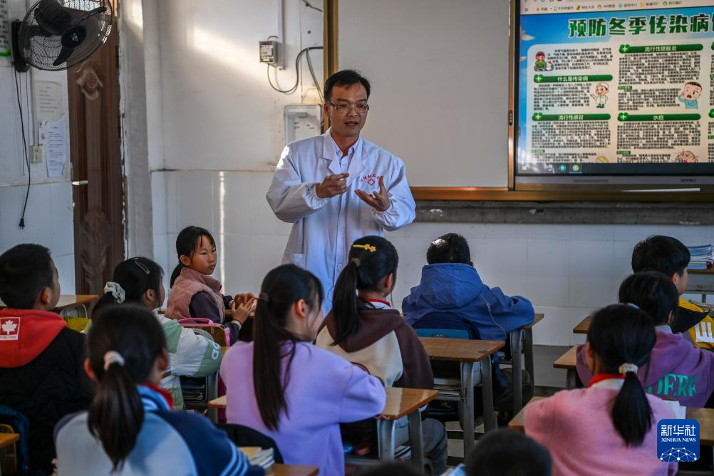 在贺州市钟山县石龙镇松桂村,潘绍瑜为小学生讲解冬季传染病的预防知识(2023年12月7日摄)。