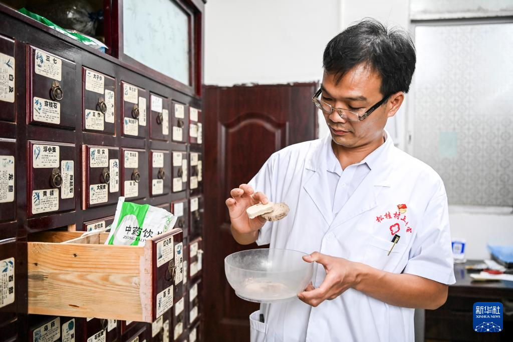 8月14日,在贺州市钟山县石龙镇松桂村卫生室,乡村医生潘绍瑜在检查中药材的保存情况。
