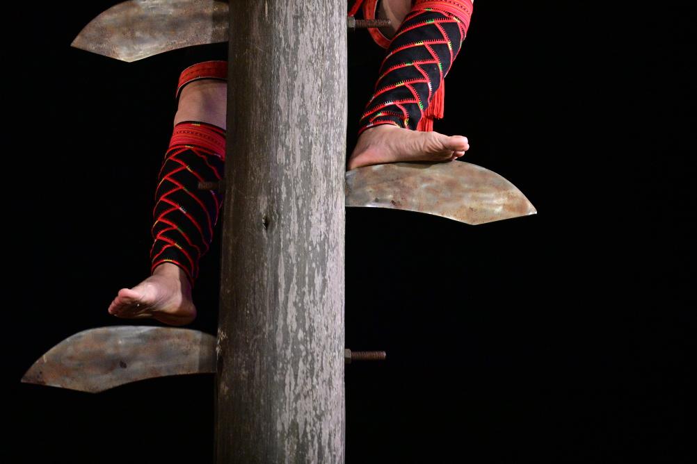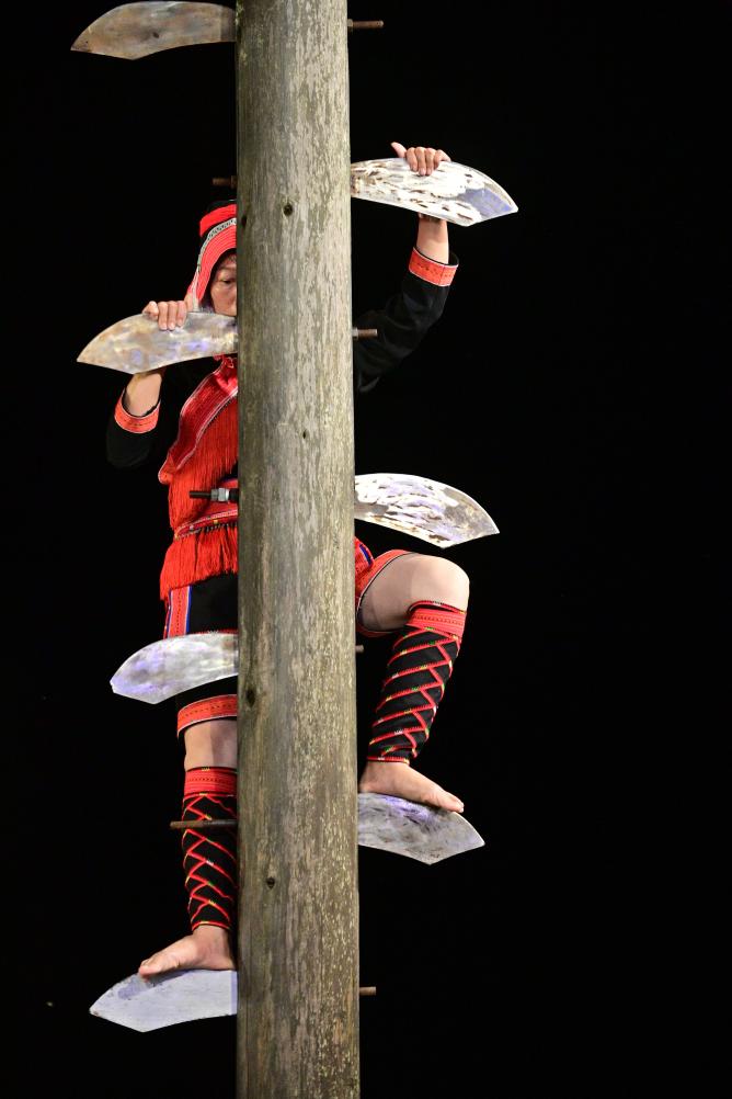 8月24日,瑶族民间绝技传承人在金秀瑶族自治县长垌乡平道村古占屯为游客表演“上刀山”。