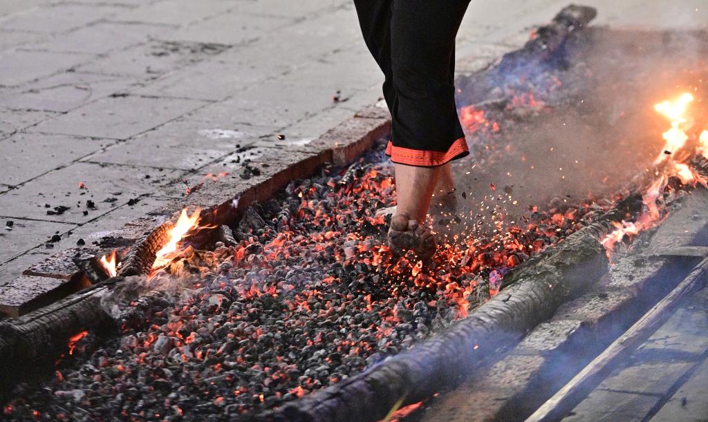 8月24日,瑶族民间绝技传承人在金秀瑶族自治县长垌乡平道村古占屯表演“下火海”。