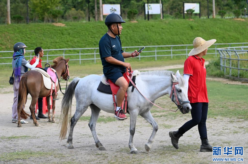 8月27日,游客在广西德保矮马王国骑德保矮马游玩。