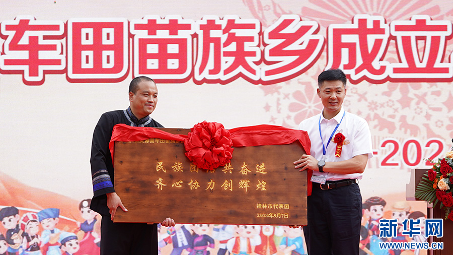 桂林市代表团副团长、市委常委、副市长陈国富(右)代表桂林市代表团向车田苗族乡赠送贺匾