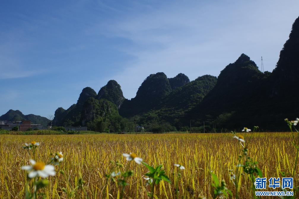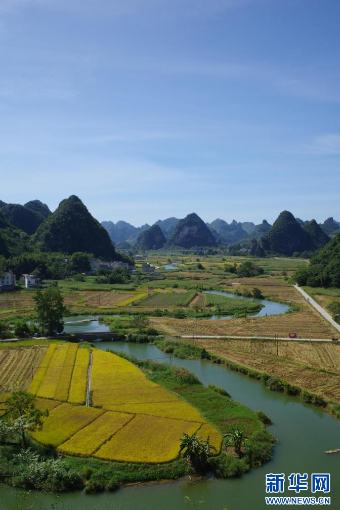 金黄的稻田嵌在村庄的空地里,在这个岩溶地貌面积占全县面积77.4%的县城里,大山环抱着稀缺的平地,庄稼拔节、生长,共鸣着土地的脉搏。