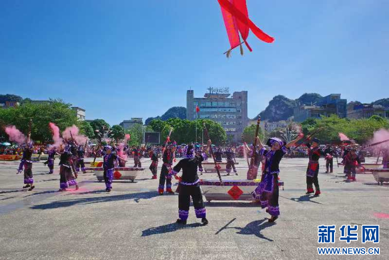 10月23日,在天等霜降节活动中,来自天等县东平镇的参赛者正在表演打榔舞。新华社记者 李欢 摄