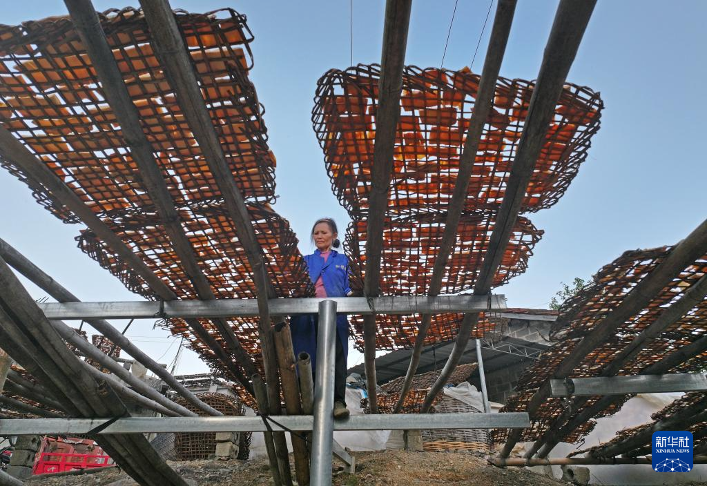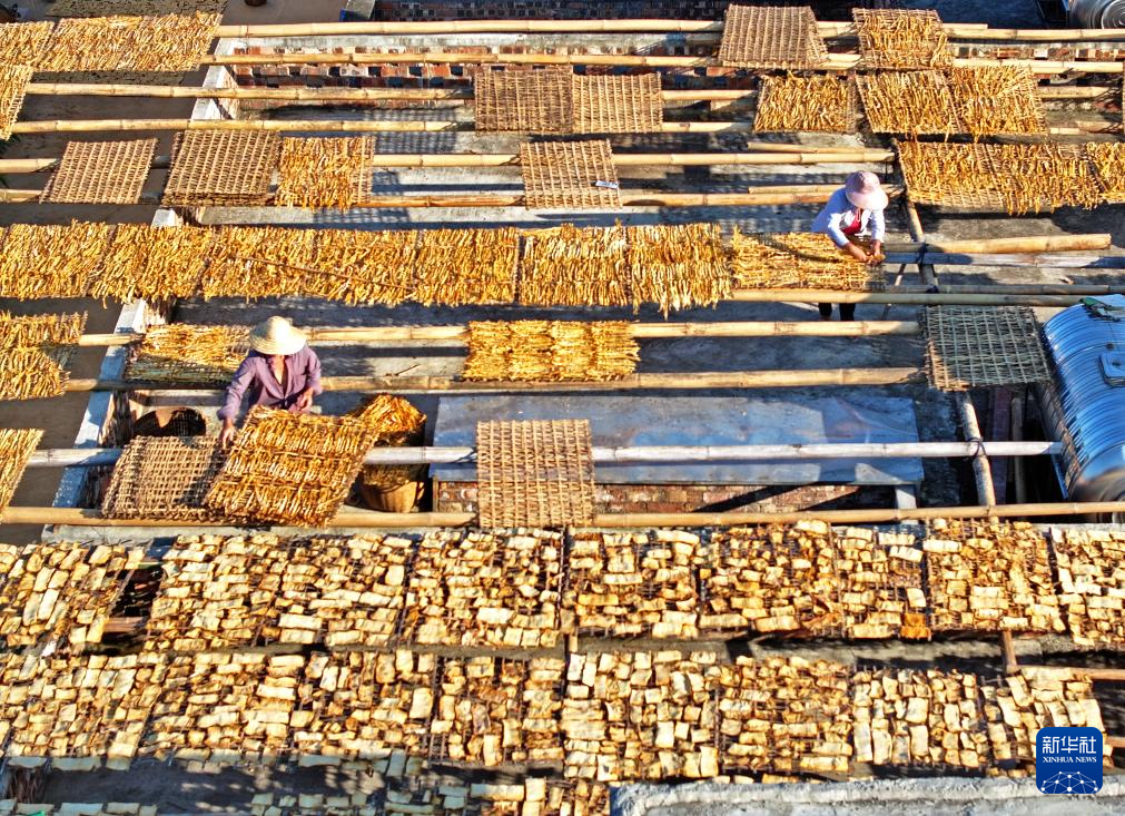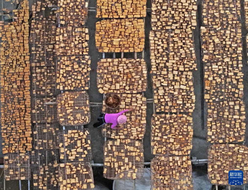 10月31日,村民在广西百色市田林县六隆镇列屯村晾晒八渡笋(无人机照片)。