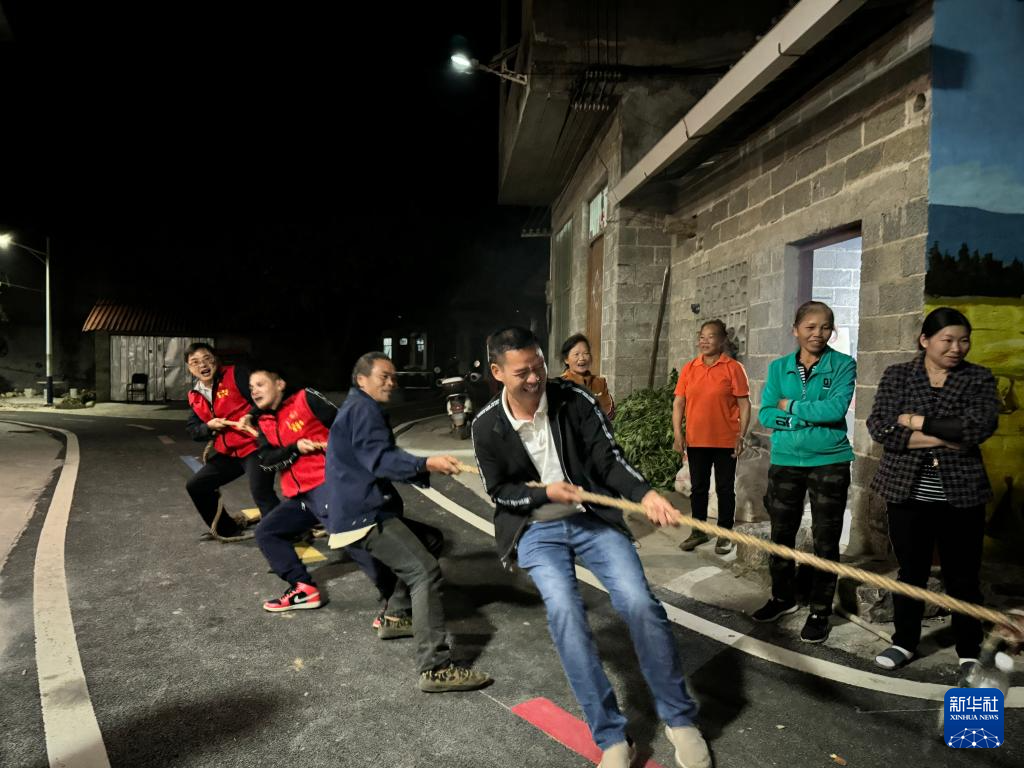 在广西百色市德保县城关镇那造村,驻村工作队员和村民们练习拔河,为第二天的趣味运动会做准备(11月4日摄)。